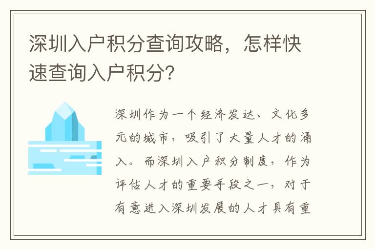 摘要:深圳积分入户政策更新,成为城市移民关注的焦点。最新政策下,深圳积分入户更加注重人才的吸引和留存。城市深处的小巷也展现出独特的风景,为移民融入深圳提供了别样的体验。这一政策与小巷风景共同展现了深圳开放包容的城市形象。
